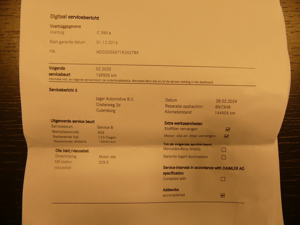 Alle technologie in de Mercedes-Benz C-klasse is er op gericht om uw rit veilig en gemakkelijk te laten verlopen. Dit mooie exemplaar uit 2016 heeft 178836 kilometer op de teller staan. De krachtige benzinemotor van deze auto is gekoppeld aan een automatische transmissie. Kijk, dat noemen we nou stijlvol: een fraai lederen interieur. Gecombineerd met het heerlijke gemak van de elektrisch bedienbare achterklep. Op koude dagen voelt u zich snel behaaglijk op de verwarmbare stoelen. Deze Mercedes-Benz C-klasse heeft luchtvering, en dat is te merken. Altijd een gelijkmatige hoogte, uitstekende demping en een solide wegligging. Natuurlijk behoren 18 inch lichtmetalen velgen, LED koplampen, halflederen bekleding, warmtewerend glas, in delen neerklapbare achterbank en LED-achterlichten ook tot de uitrusting van deze complete auto.Kinderfietsje niet gezien bij het inparkeren? Dat gebeurt u nooit meer. Daar zorgt de achteruitrijcamera wel voor! Pech of storing, altijd vervelend. Maar met Connected Services weet u direct wat eraan scheelt. En dus ook wat er moet gebeuren. Deze auto kent elke bestemming als z'n broekzak, dankzij het full map navigatiesysteem. De automatische airconditioning zorgt voor een behaaglijk klimaat in de auto. Alle belangrijke audiofuncties zijn regelbaar zonder het stuur los te laten. De knoppen bevinden zich onder uw vingers. Ook schakelpaddles aan het stuur, regensensor, cruise control, automatisch dimmende buitenspiegels en centrale deurvergrendeling met afstandsbediening zijn aan boord.